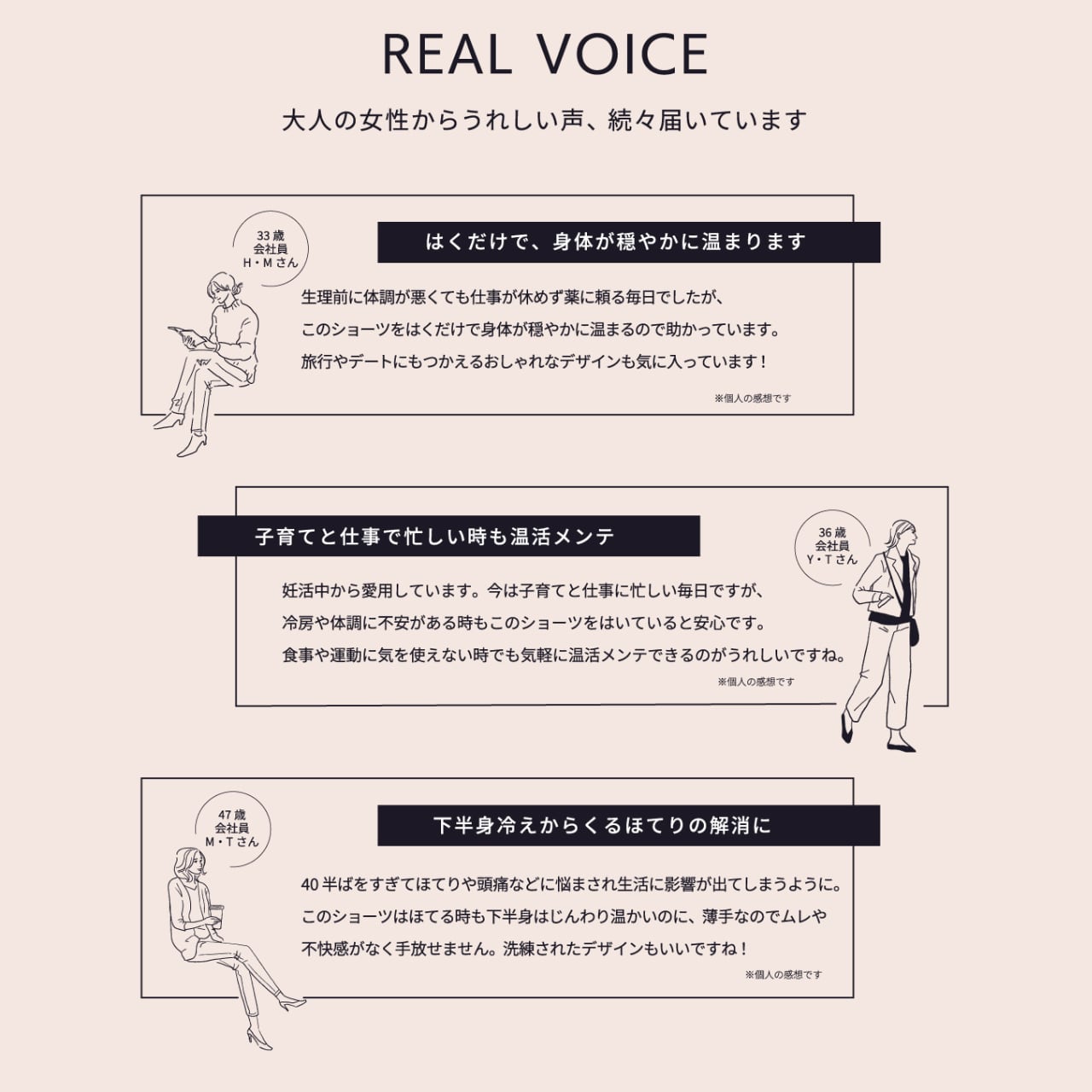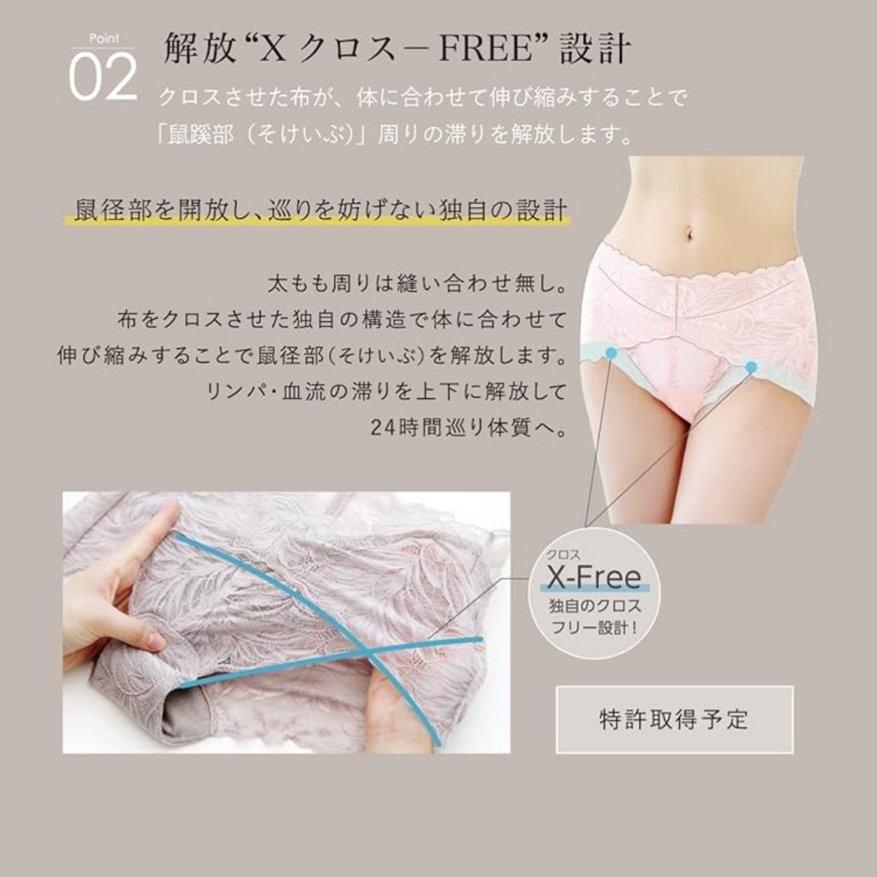 多くの女性が悩む冷えと巡りに関する悩みを解決したいという想いから誕生しました。クロッチ部分に入れた自然由来の蓄熱素材が子宮まわりをあたためる、まるで“穿くよもぎ蒸し”のようなショーツです。そけい部を締め付けない独自設計により、おうち時間も快適におくつろぎいただけます。